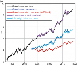 Fig. 3.15. (a) (black) Monthly averaged global mean sea level observed by satellite altimeters (1993–2018 from the NOAA Laboratory for Satellite Altimetry). (blue) Monthly averaged global ocean mass (2003–Aug 2017 from the Gravity Recovery and Climate Experiment). (red) Monthly averaged global mean steric sea level (2004–18) from the Argo profiling float array. (purple) Mass plus steric. (cyan) Inferred global ocean mass calculated by subtracting global mean steric sea level from global mean sea level. All time series have been smoothed with a 3-month filter.