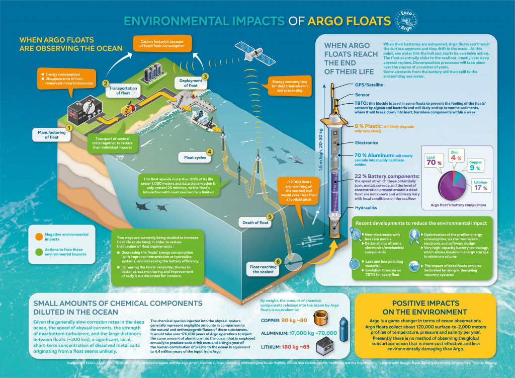 S. Riser, S. Wifjjels and the AST have written Argo’s environmental impact statement which explores this topic in detail. This webpage simply summarizes key findings from the review, so please refer to the actual statement for more information. In addition, there is now a leaflet created by EuroArgo which can be printed and folded, shown as a poster or shown on a screen. The leaflet takes the information from the impact statement and conveys it via graphics and short descriptions.