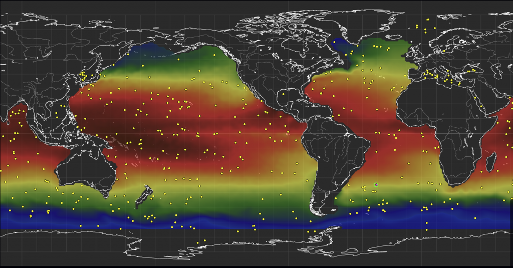 Maps displaying statistics about the Argo array, including its extensions into high latitudes and marginal seas, biogeochemical sensors, communication systems, float type, etc., can be found in the map section on the Argo Information Centre website.