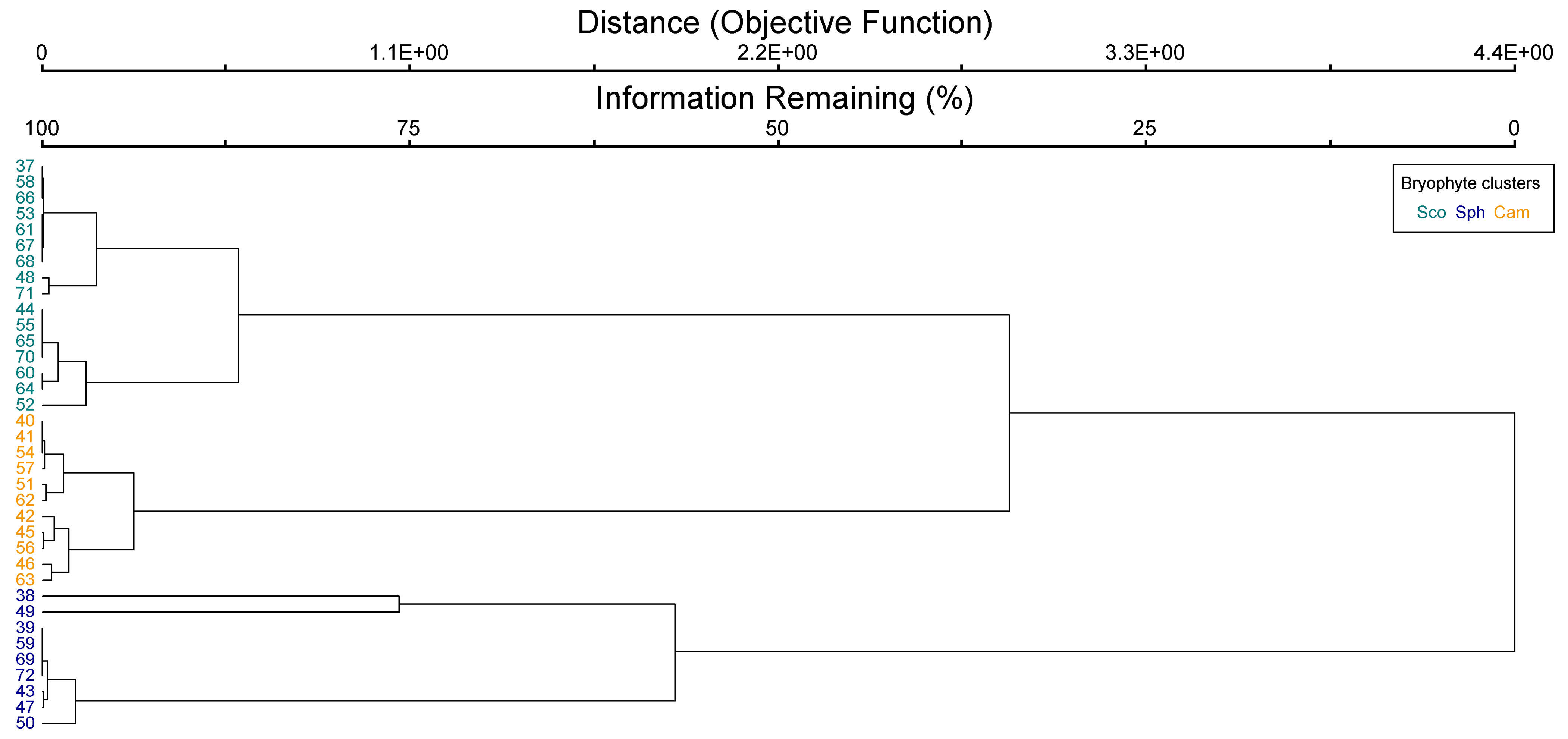 Figure B3Cluster dendrogram of bryophyte data. Indicator species by clusters: Sco = Scorpidium cossonii, Sph = Sphagnum spp. and Paludella squarrosa, and Cam = Campylium stellatum.