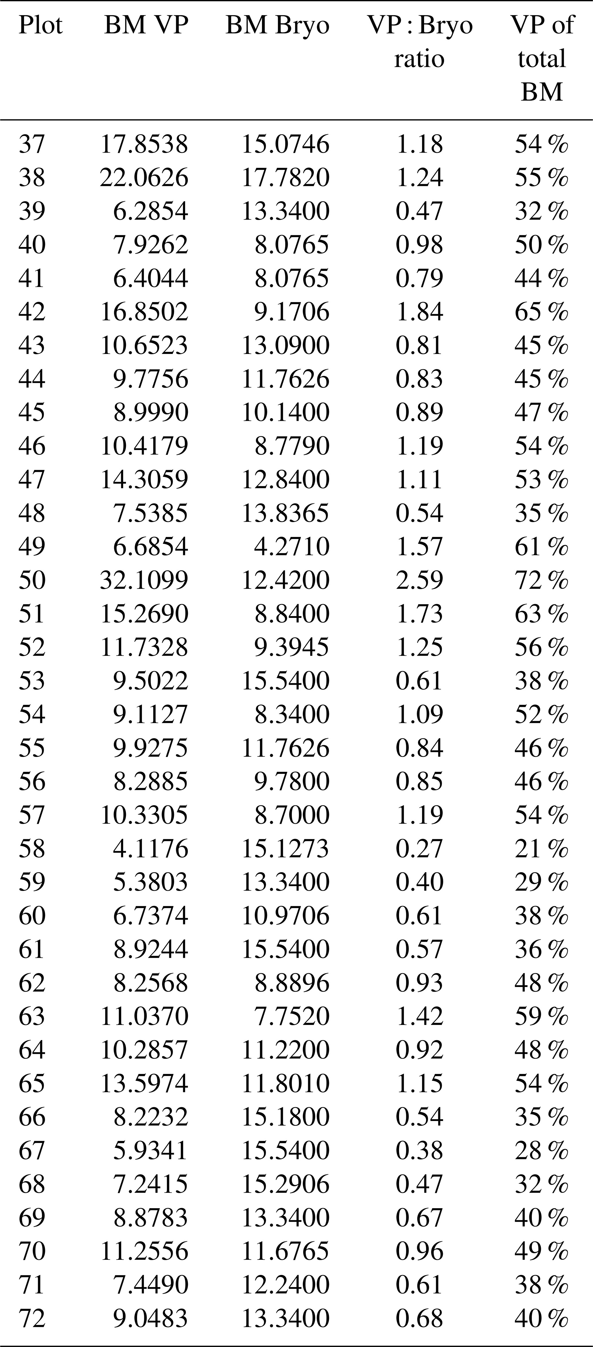 Table A2Total plot-scale dry mass weight biomass (BM) of vascular plants (VP) and bryophytes (Bryo) in grams inside the collar (A=660.5 cm2) at each experimental plot (37–72), a VP to Bryo BM ratio (VP : Bryo ratio), and the portion of VP BM in the total BM (VP of total BM).