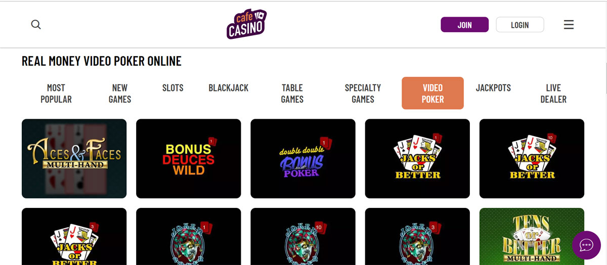 The game collection at Cafe Casino includes an extensive collection of more than 70 top-tier online slots, video poker, specialty, and table games, ensuring a diverse and captivating gaming experience for its players.