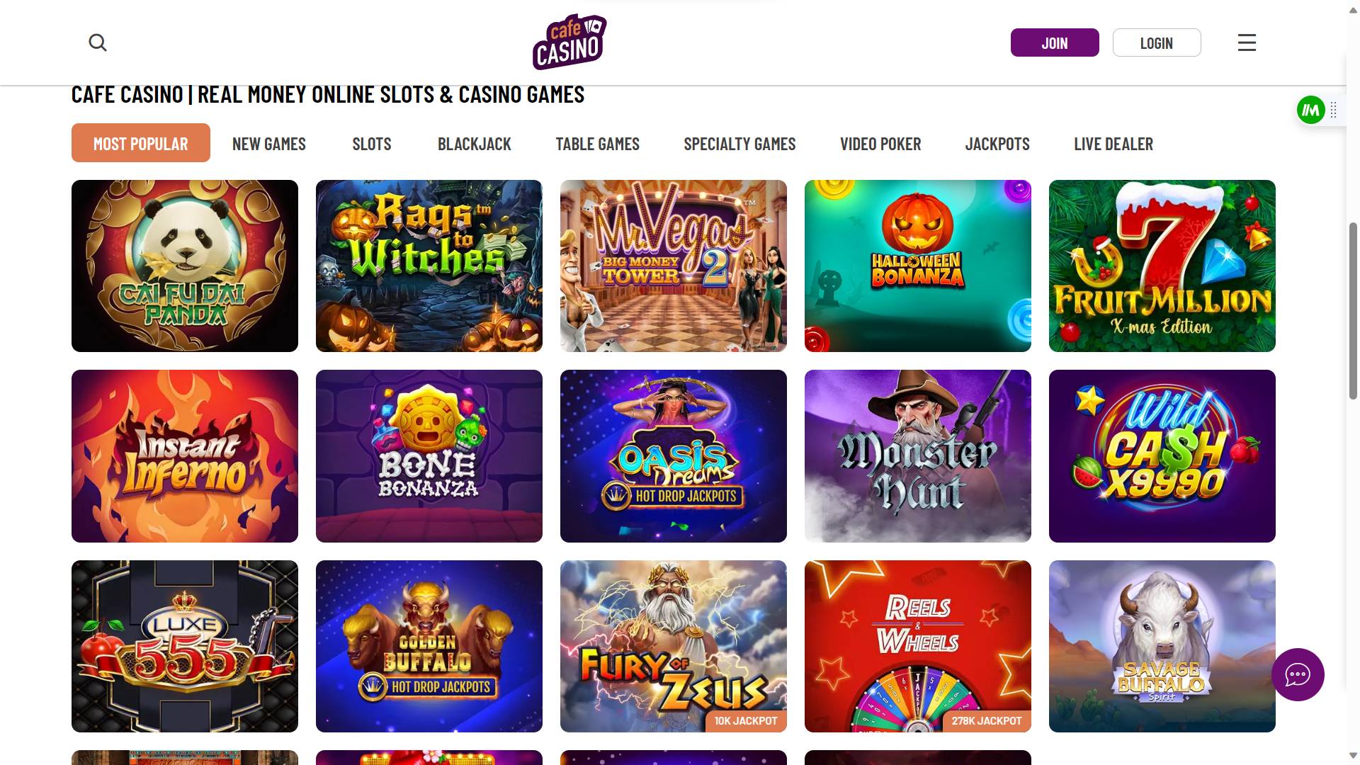 Cafe Casino offers a broad-ranging assortment of games to suit varied preferences, encompassing slots, blackjack, table games, specialty games, video poker, jackpots, live dealer games, and hot drop jackpots. Particularly noteworthy is the extensive selection of over 490 slot titles, curated from esteemed software providers within the industry. Whether gambling enthusiasts prefer the thrill of spinning the reels on slots, testing their skills at blackjack, enjoying the classic appeal of table games, exploring unique specialty games, strategizing in video poker sessions, chasing big wins in jackpots, engaging in interactive live dealer experiences, or aiming for hot drop jackpots, there's something to satisfy every gaming preference.
