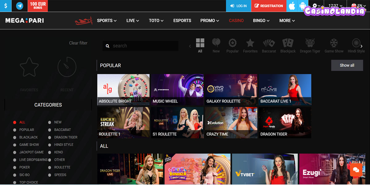 MegaPari Casino offers not only regular casino game options, bingo, toto, e-sports, and sports betting, but also has a smashing live dealer game selection of over 50 titles.