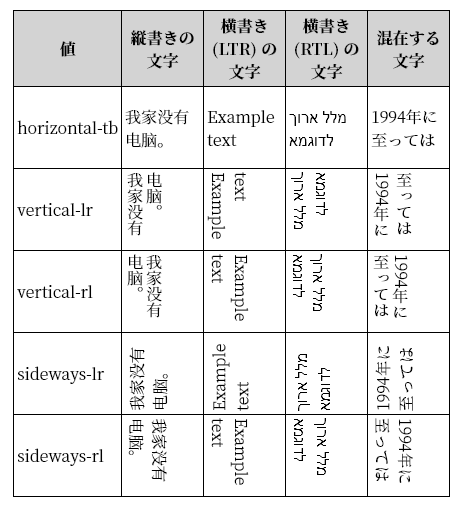 であり、行方向に書字方向を、列方向にその書字方向を使用してさまざまな種類のテキストが表示される様子を表します。