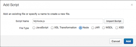 - In the Add Script dialog, select the file type Node and name the script.