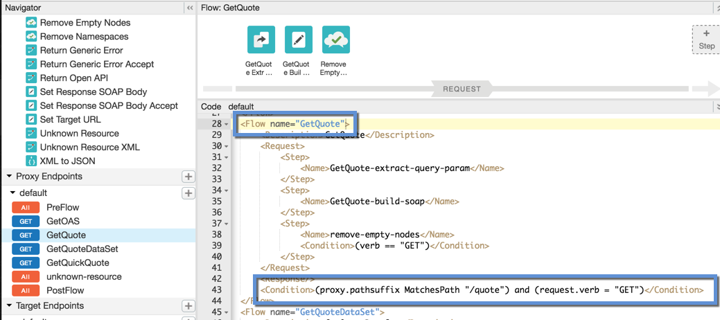 On the API proxy's Develop tab, in the left Navigator pane you'll see a list of flows under the Proxy Endpoints. Click the flow you're interested in. For example, the GetQuote flow is a good candidate. Then view the XML in the Code pane, which shows the resource path and verb for the flow in the <Condition> element: /quote and GET.