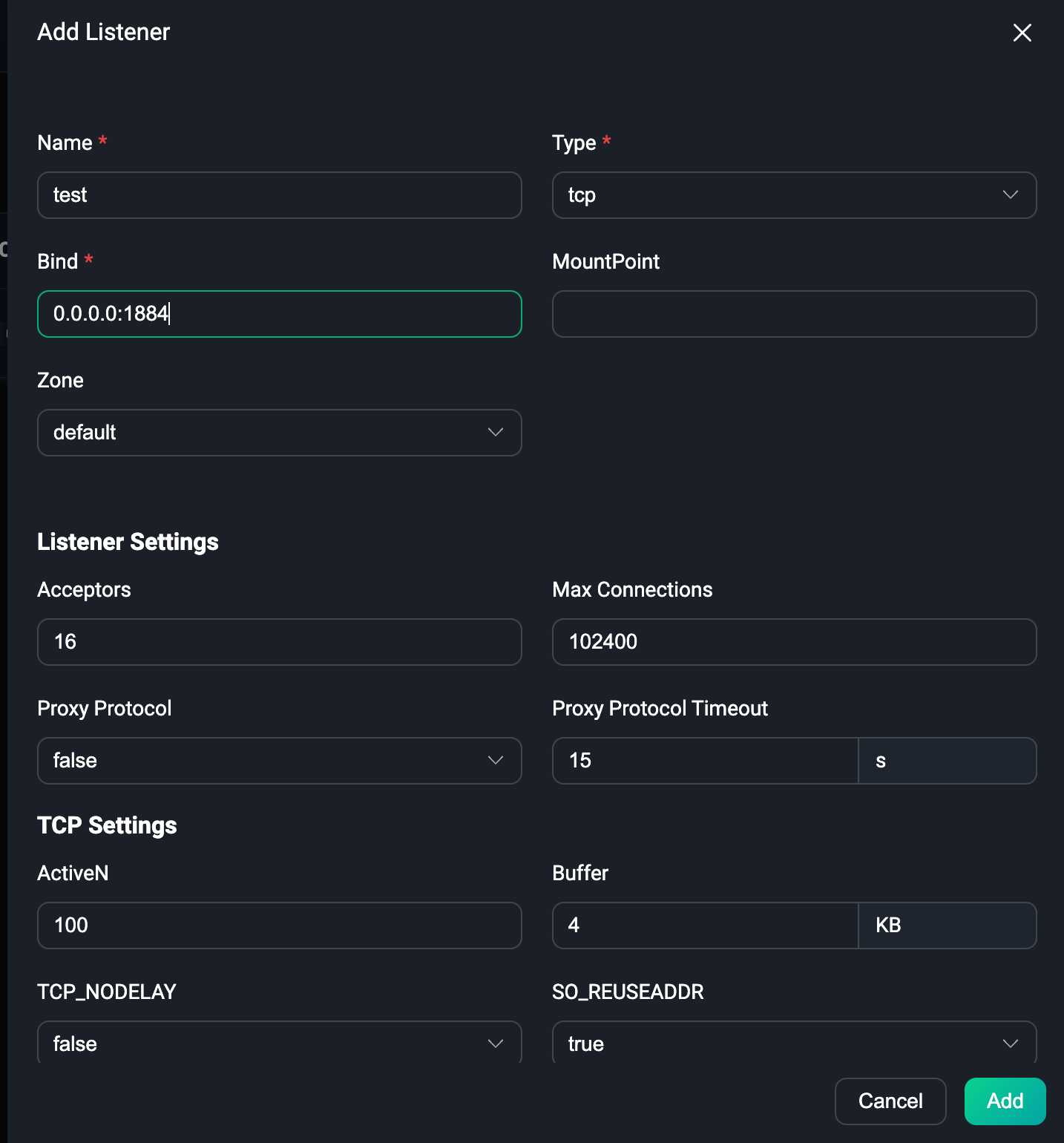Open the browser to login the EMQX Dashboard and click Configuration → Listeners to enter the listener page, we first click the Add Listener button to add a name called test, port 1884 The listener, as shown in the following figure: