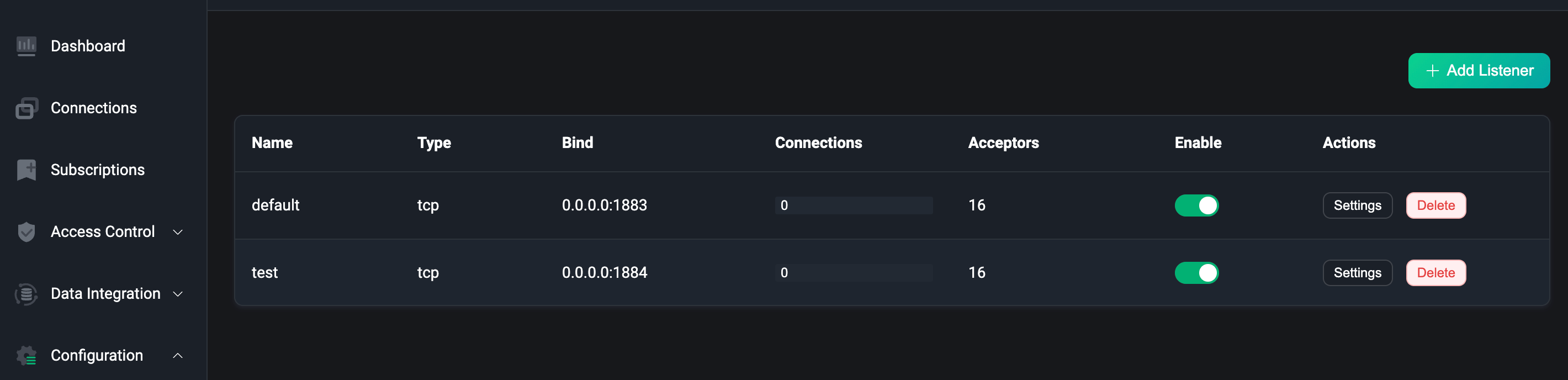 tcp-defaultcorresponding to port 1883 and Dashboard listenerdashboard-listeners-http-bindcorresponding to port 18083.Users can add new listeners through
