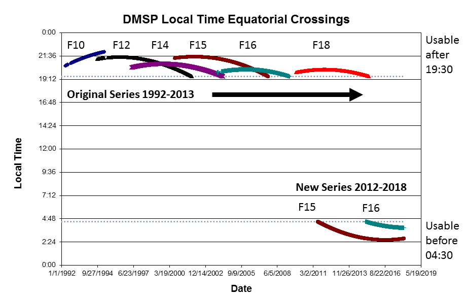 The original global nighttime lights time series from DMSP was produced using OLS data from six individual satellites (Figure 1). Over time, the orbits of each satellite gradually shifts to an earlier overpass time, sliding from a day / night orbit to a dawn / dusk orbit. The DMSP sensors collected sufficient nighttime data worldwide for annual nighttime lights product generation as long as the overpass occurred later than 19:30. Recently, NOAA added additional years to the DMSP equatorial crossing time chart and discovered that the F-15 orbit had continued to shift and had started to collect pre-dawn nighttime data in 2012 and that this continued through 2018. Satellite F16 may have also collected usable nighttime data in the pre-dawn hours.