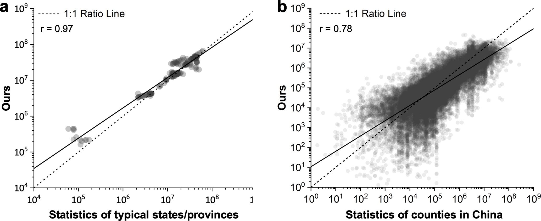 Figure 5Livestock number comparisons with (a) state/province level and (b) county level statistics. Dots represent the number of livestock at administrative levels based on AGLW and statistical records.