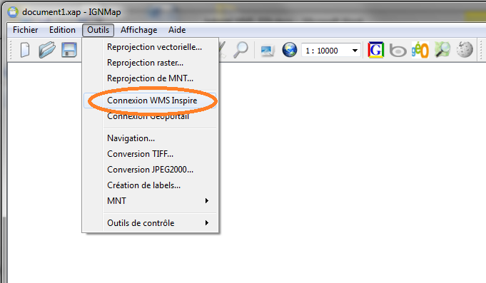 Dans le menu Outils cliquer sur Connexion WMS Inspire.
