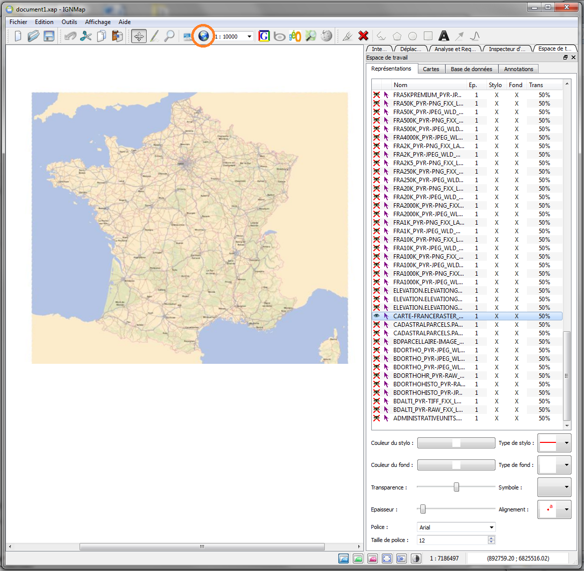 Les données, par défaut, sont masquées. Pour les rendre visibles, cliquer à droite sur l’onglet Espace de travail, puis dans la fenêtre Représentations, décocher l’icône correspondant aux données à visualiser. Cliquer sur l’icône Zoom sur l’ensemble du chantier pour zoomer sur l’emprise de la couche sélectionnée.