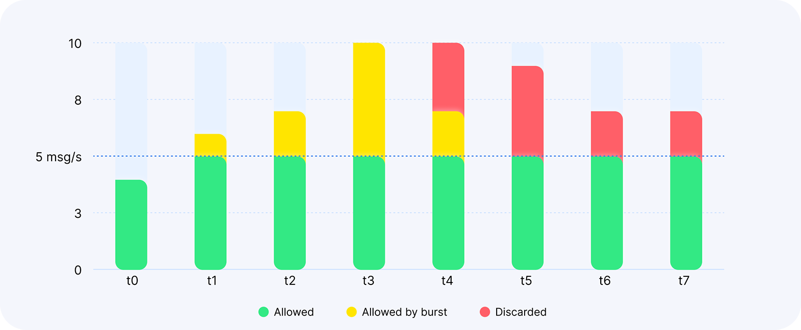 In this example, the client will receive several more messages above the 5/s limit (the yellow bar), and once this burst credit is over, the client will stop receiving more than 5 messages per second. The burst credit is set to 10 messages on an 8 seconds rolling window.