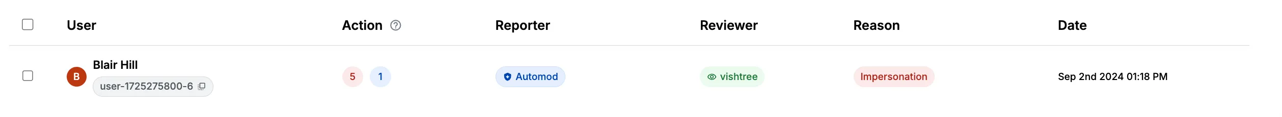 - If the user was reported by some internal rule, you will see “Automod” as the reporter. E.g., if any content posted by this user was caught by the automod system.