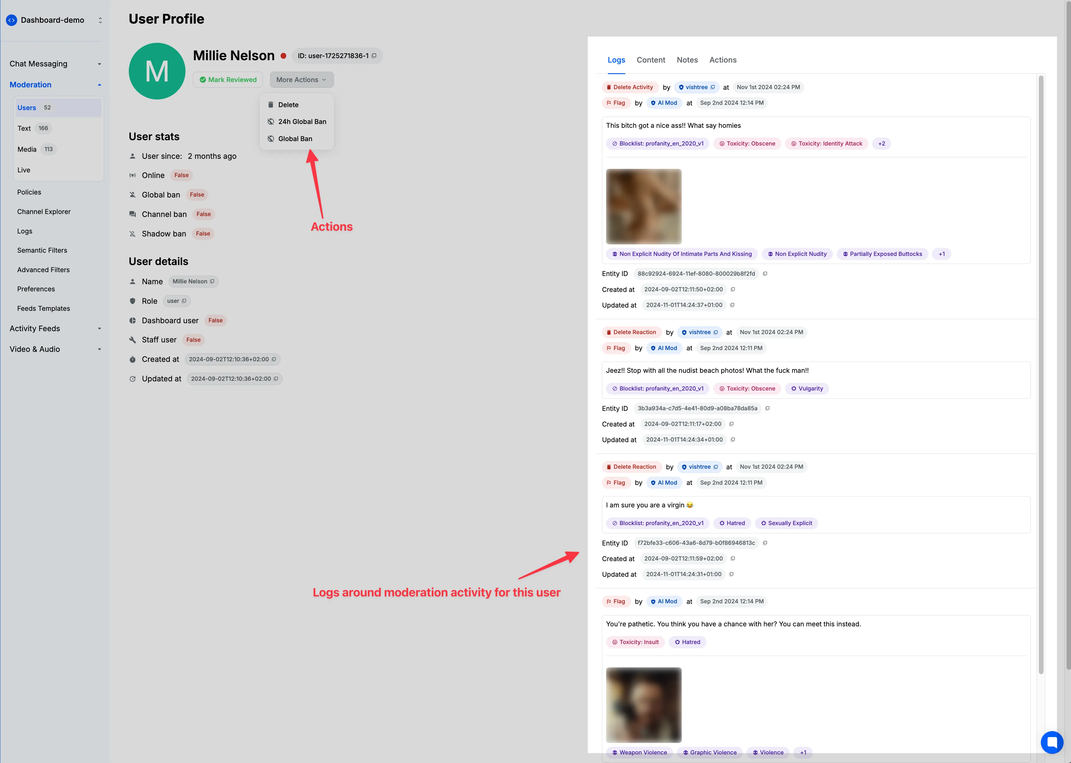 This tab shows all the history of moderation-related activity around this user. Let’s take a look at examples of a couple of logs: