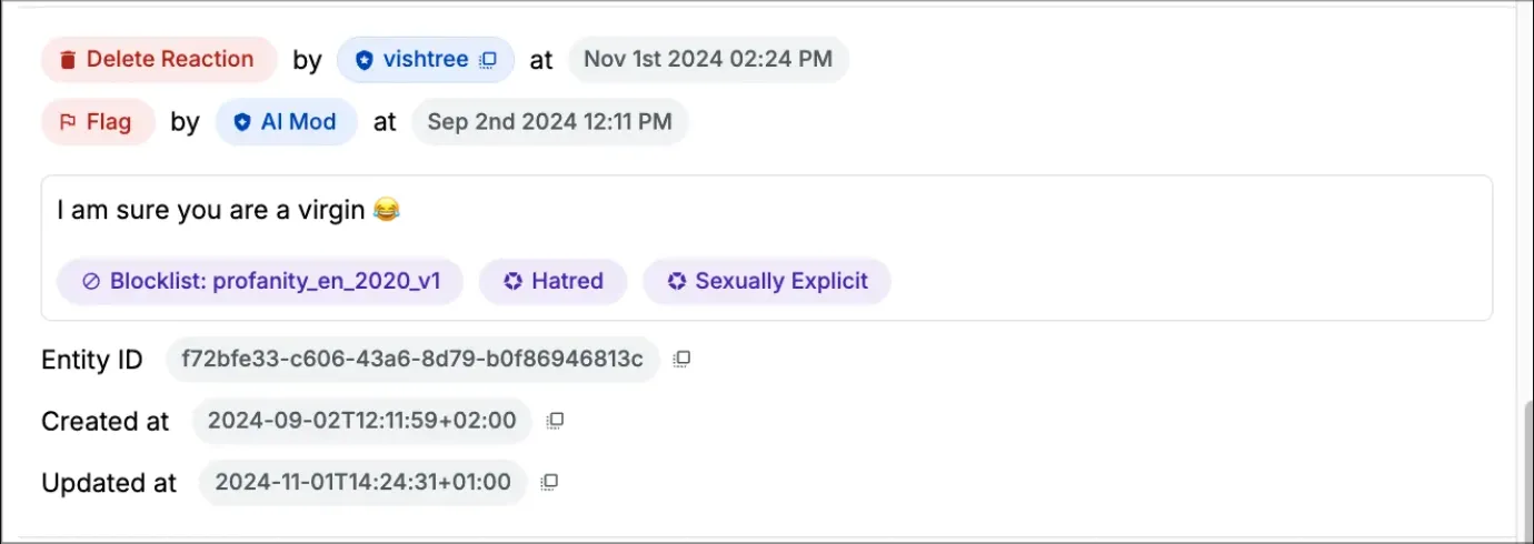 f72bfe33-c606-43a6-8d79-b0f86946813c. In the case of chat, this ID will be the message ID. In the case of the activity feed, this ID will be the activity ID or reaction ID. - This text was flagged by “AI Mod”. The moderation engines that flagged this content were: