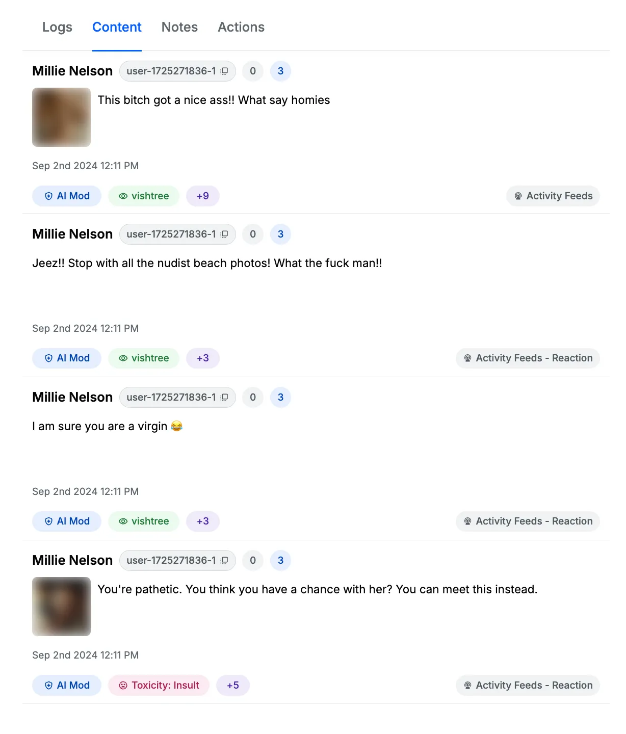 This tab shows all the content posted by this user that was flagged by the moderation engines or manually flagged by other users. You can click on any content to see more details about it. The explanation can be found in the Text Queue Details document. While reviewing the user, you can go through the content and take actions on it before marking the user as reviewed or taking any other actions.