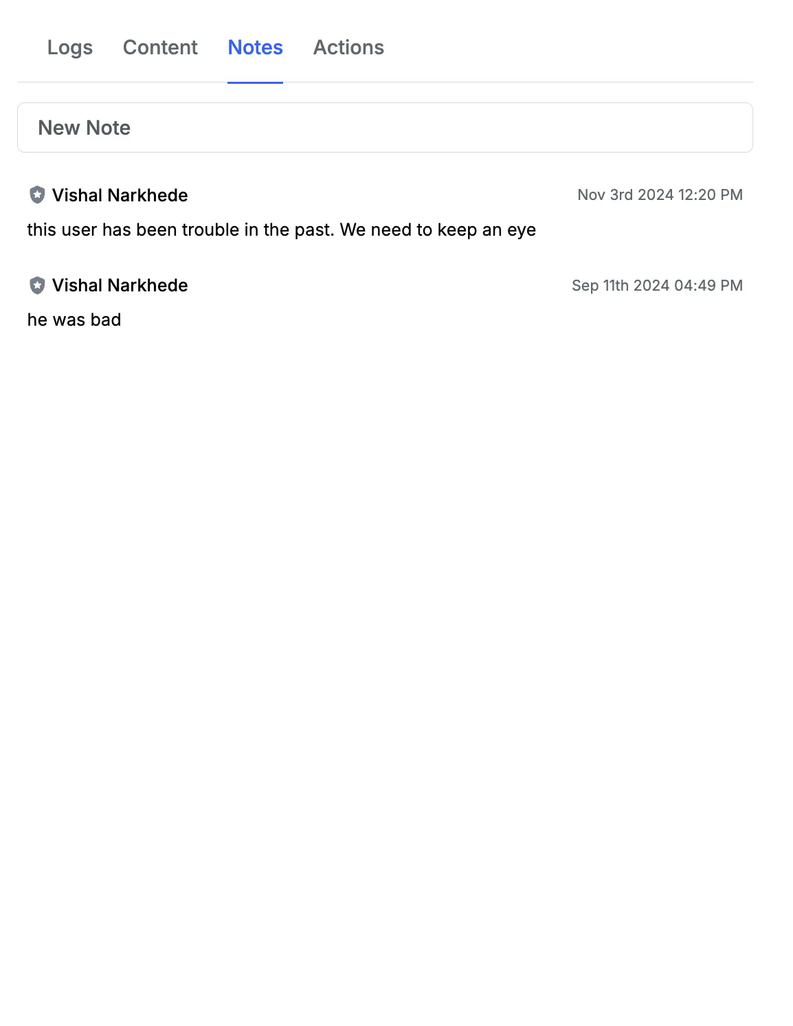 This tab shows all the notes added by the moderators about this user. You can add notes about the user here, which will help you identify the user in the future.