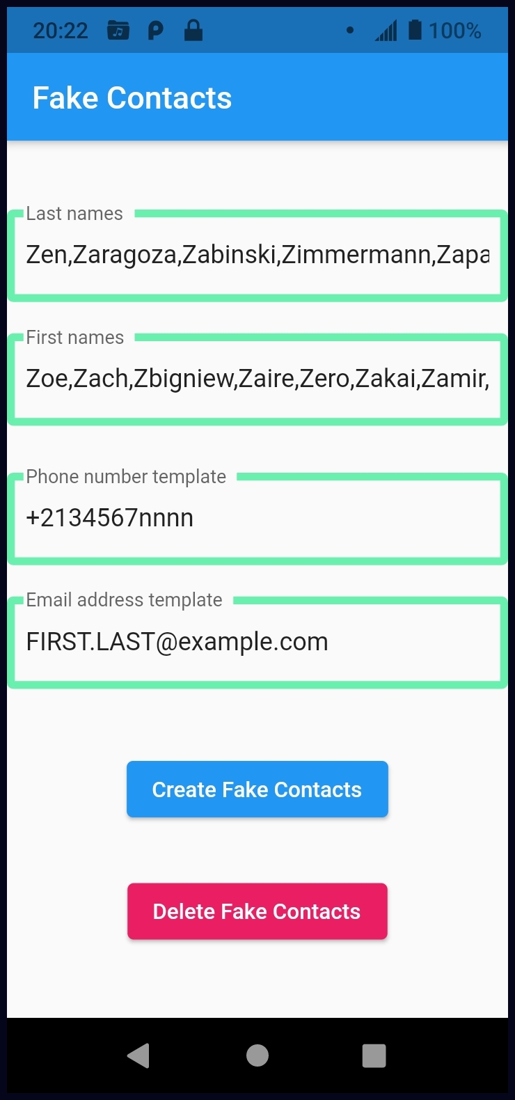 The user can set lists of last names and first names for fake contacts, and phone-number and email-address templates for them. Then click buttons to create or delete fake contacts with all combinations of the first and last names.