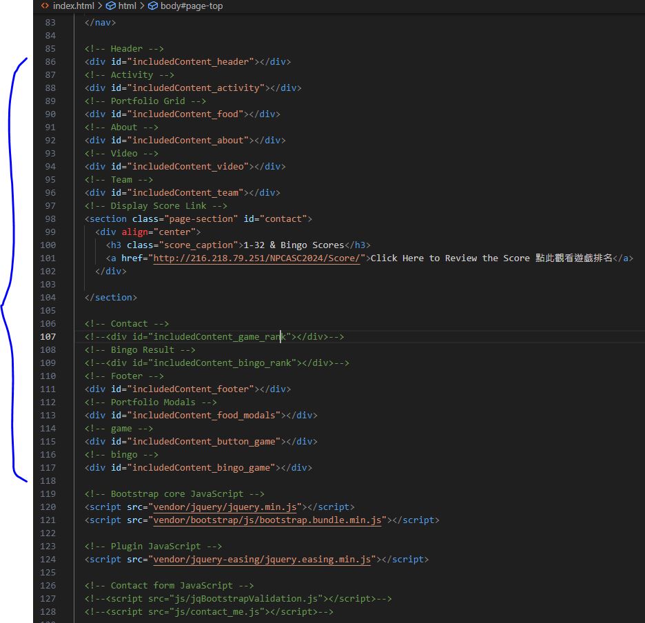 This is where child HTML files content will be loaded and displayed. Because the browser will read line by line, so the order in the following will be reflected on the website. Actually, those div tag just act like a place holder, the browser will literally insert all the loaded HTML code into these place holder (reference by the id). However, I cannot move the Navigation bar away to separate HTML file. I do not know the reason and cannot find any solution.