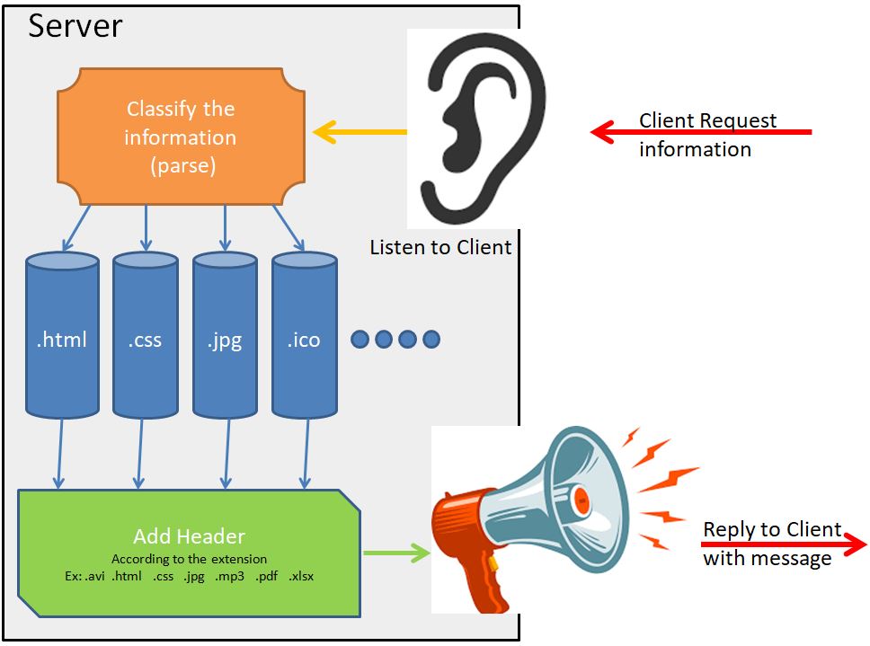 The story is, the server keep listening any message it received, then we need to analyze what the useful information in the message by parsing it. The useful information we care about is the file name (with path) and file extension. The server then open the file according to the path and put the content of the file into a reply-message which we will later send to the client. Before sending the reply-message, we should first tell the client what kind of file content type we are going to send, maybe image file (.jpg, .png, ...) or txt file (.html, .doc, ...) and so on (refer to https://developer.mozilla.org/en-US/docs/Web/HTTP/Basics_of_HTTP/MIME_types/Common_types), then we can send the reply-message (content of file) to the client.