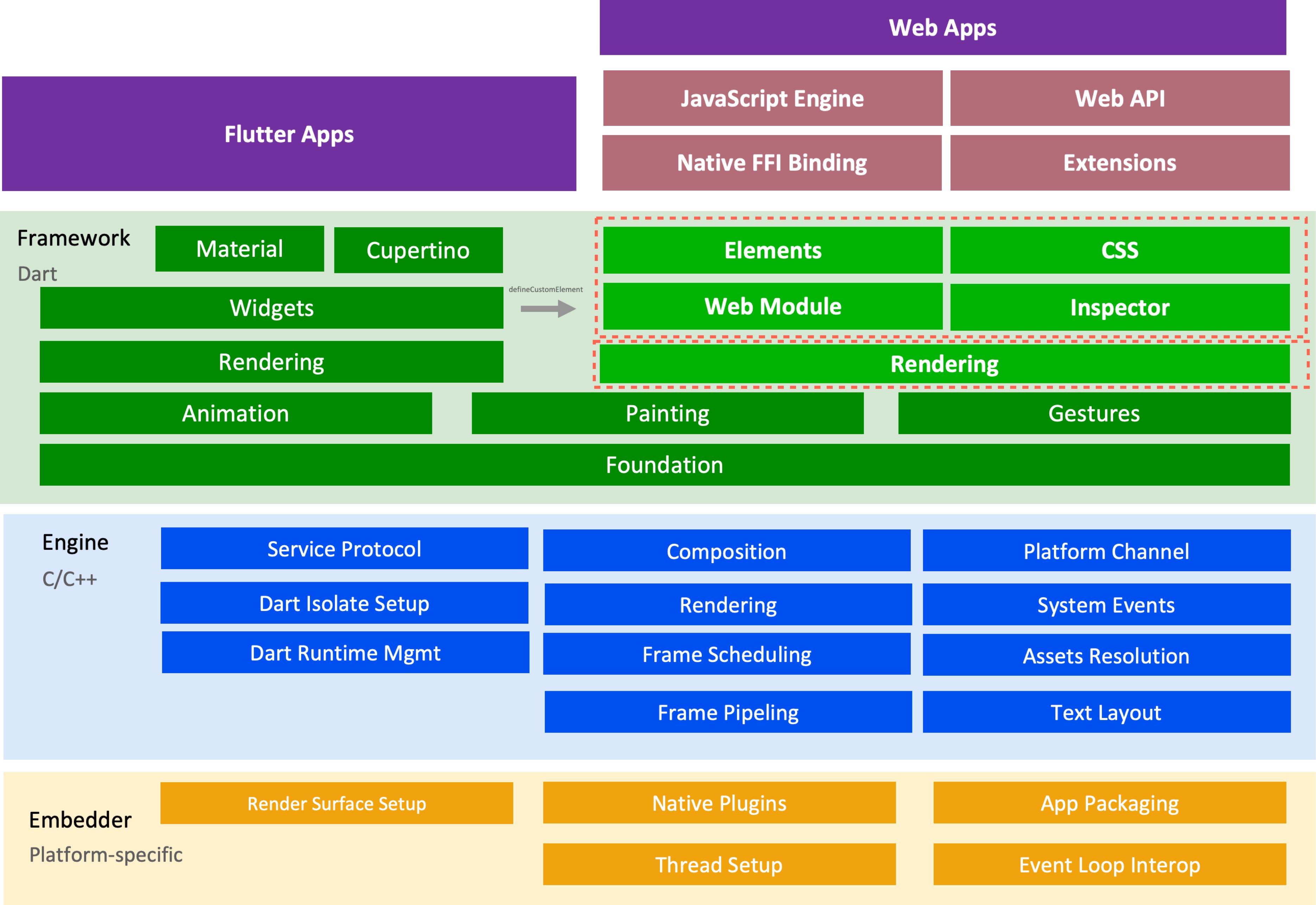 }flutter runWebF provides a rendering engine which follows the W3C standards like web browsers do. It can render HTML/CSS and execute JavaScript. It's built on top of the flutter rendering pipelines and implements its own layout and painting algorithms.