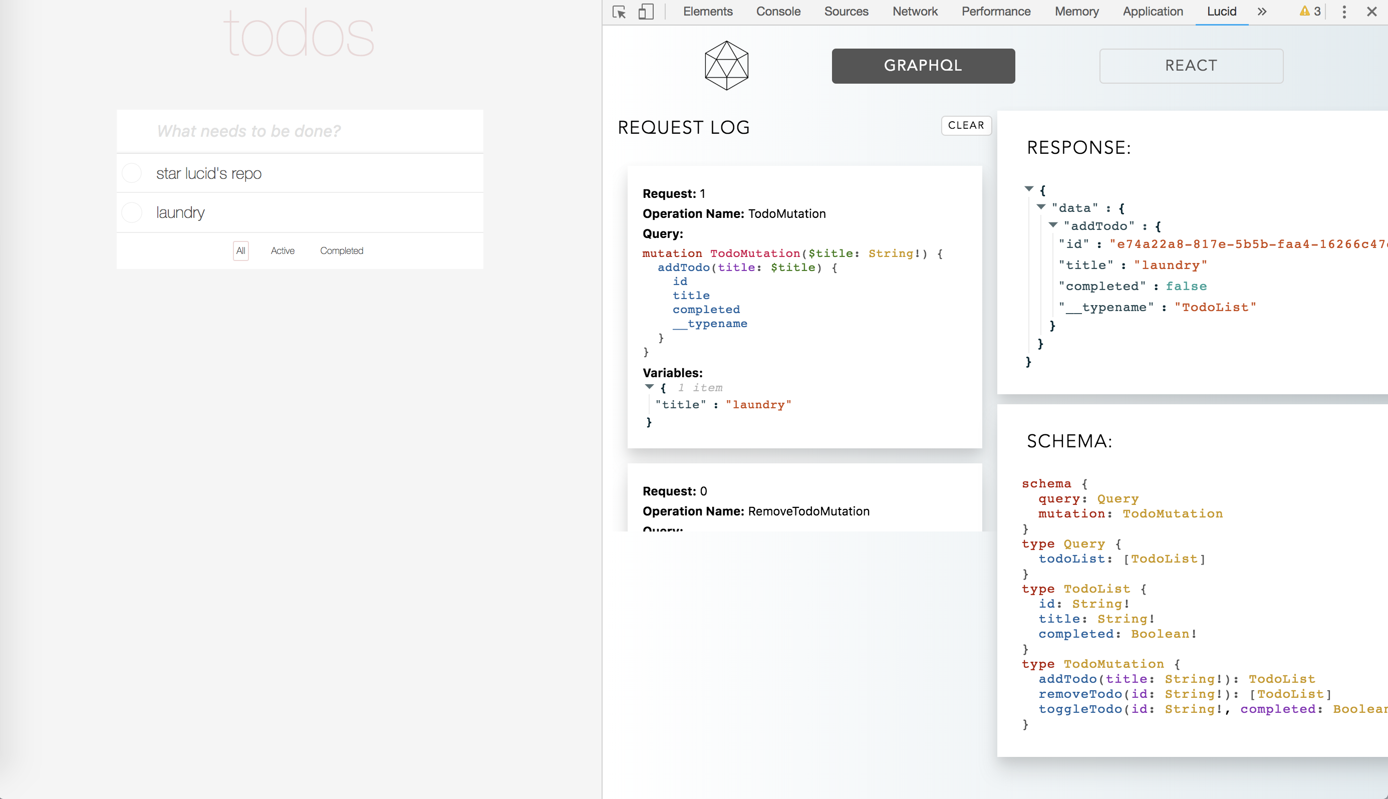 Lucid intercepts HTTP requests using Chrome Devtool APIs to display a log of real-time Apollo client queries and mutations, along with associated response objects. Lucid also uses GraphQL schema introspection to display schema information from the server. This allows full-stack developers to debug their app from the front-end to the back-end, as requests are generated, responses are returned from the server, and data flows through React components to be rendered in the DOM.