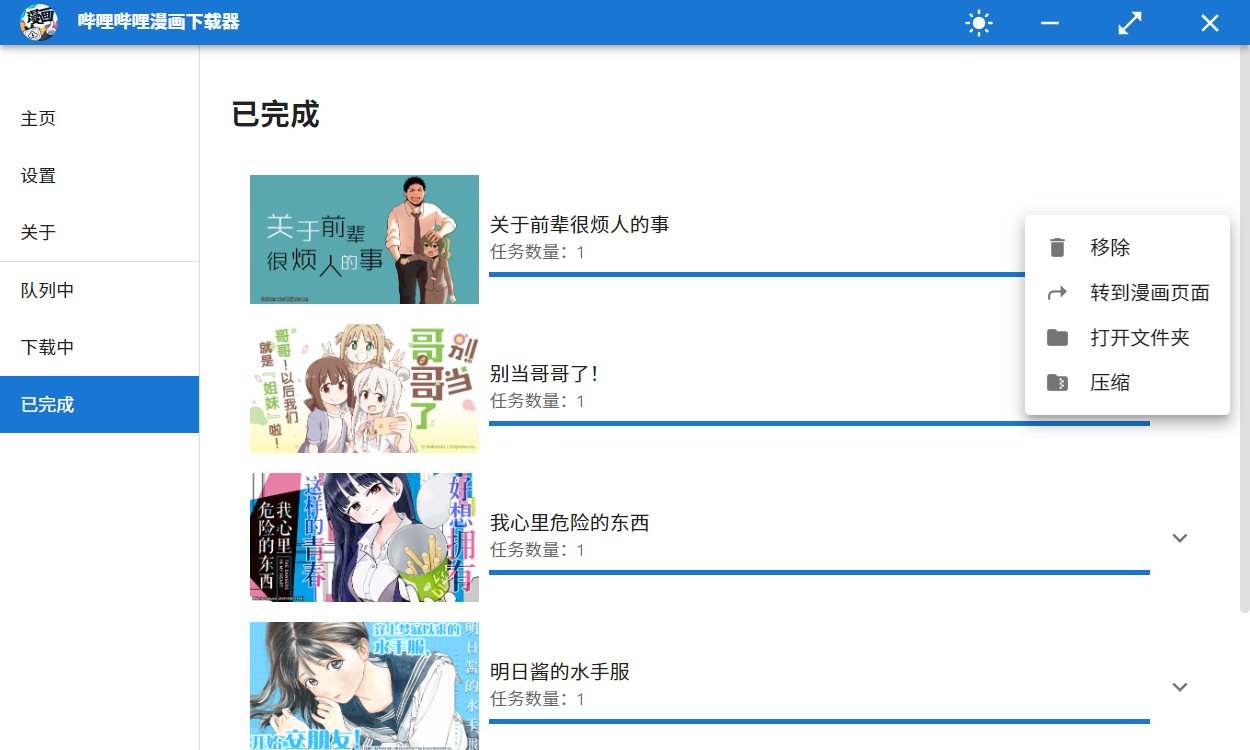 ==下载完成后是否压缩==,该选项开启后会在每集下载完成后对该漫画文件夹进行压缩,随着该漫画文件夹所含有的话数越来越多,压缩速度也会逐渐变慢。因此推荐在需要下载任务的全部完成后手动进行压缩。