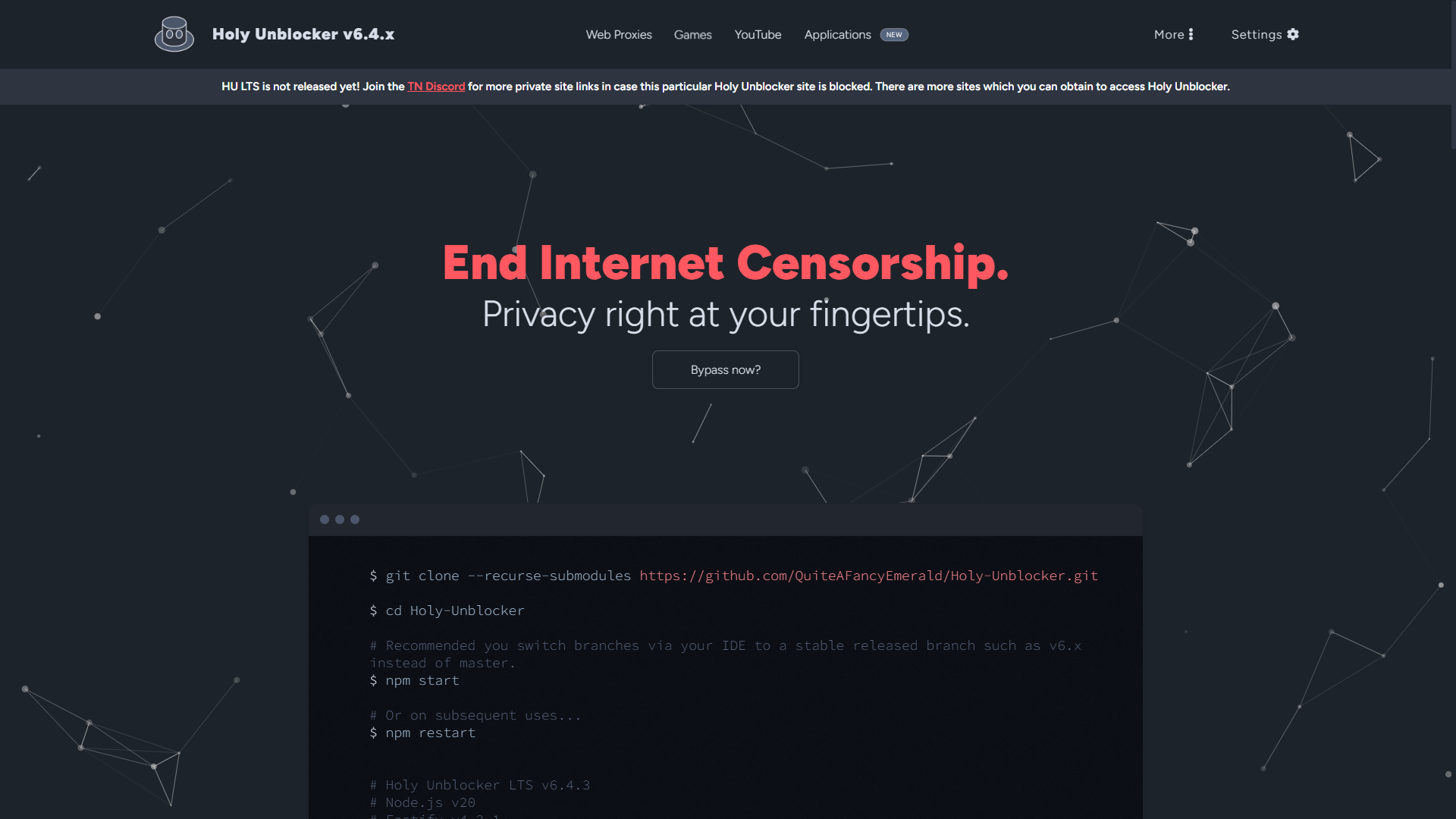 This project serves mostly as a proof of concept for the ideal clientless solution to bypassing censorship. A good use case of this project would be if you ever needed a clientless solution to use Tor or leave minimal traces of device activity. Simply host this project on any domain and have an alternative solution to a VPN without needing to download anything on said device. Being a secure web proxy service, it supports numerous sites while being updated frequently and concentrating on being easy to self-host. Holy Unblocker LTS works with a large number of sites, including YouTube, Discord, GeForce NOW and more! Also has a good amount of locally hosted games featured on the site.