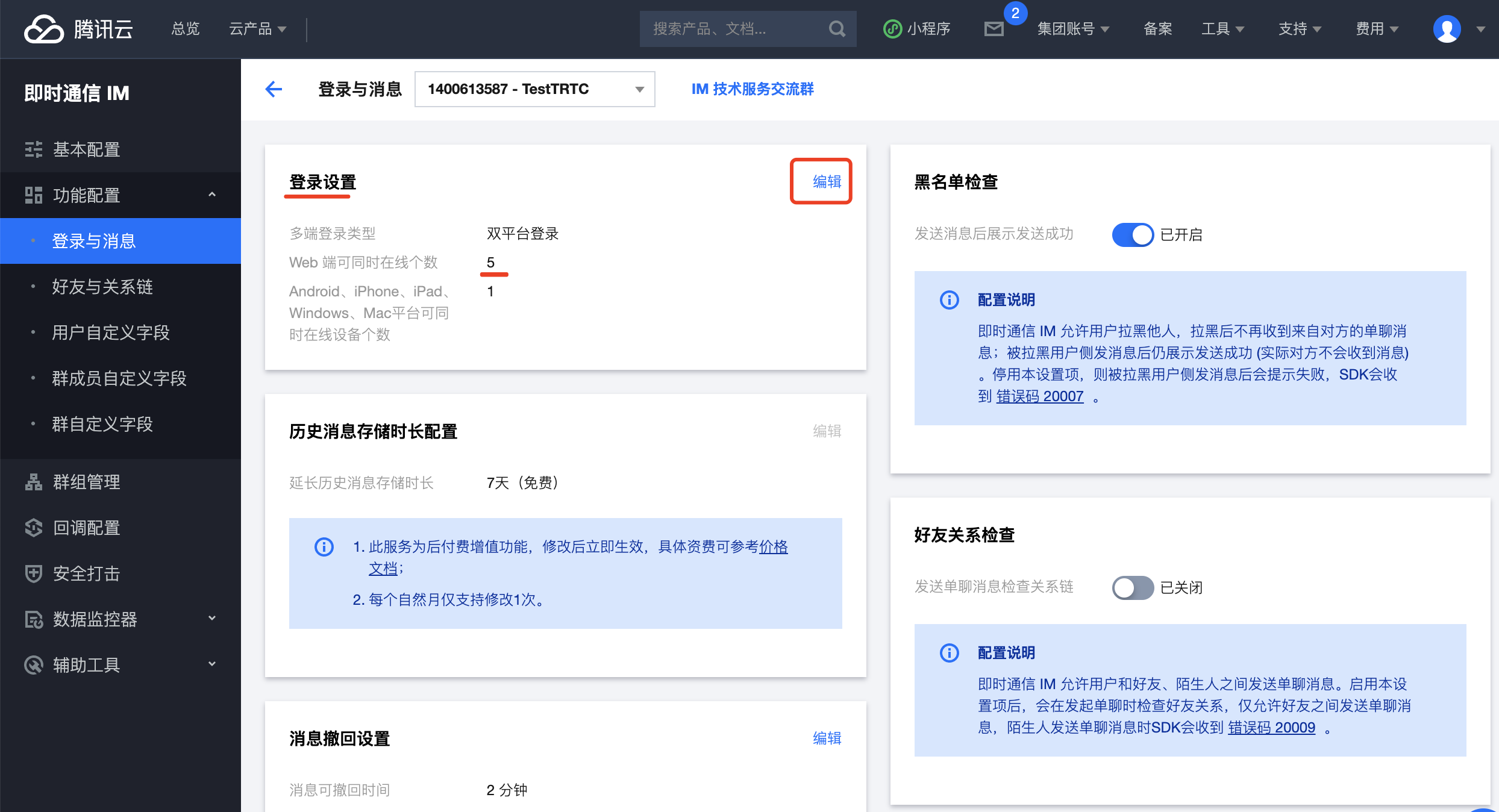 - 打开菜单:【功能配置】 -> 【登录与消息】 ,如下图所示,点击 【登录设置】 区域的 【编辑】 链接,将 【Web 端可同时在线个数】 设置为大于等于 2 的值(目前本应用最多需要同时登录 2 个 Web IM 实例,可以设置更多一些,以备后续使用)。