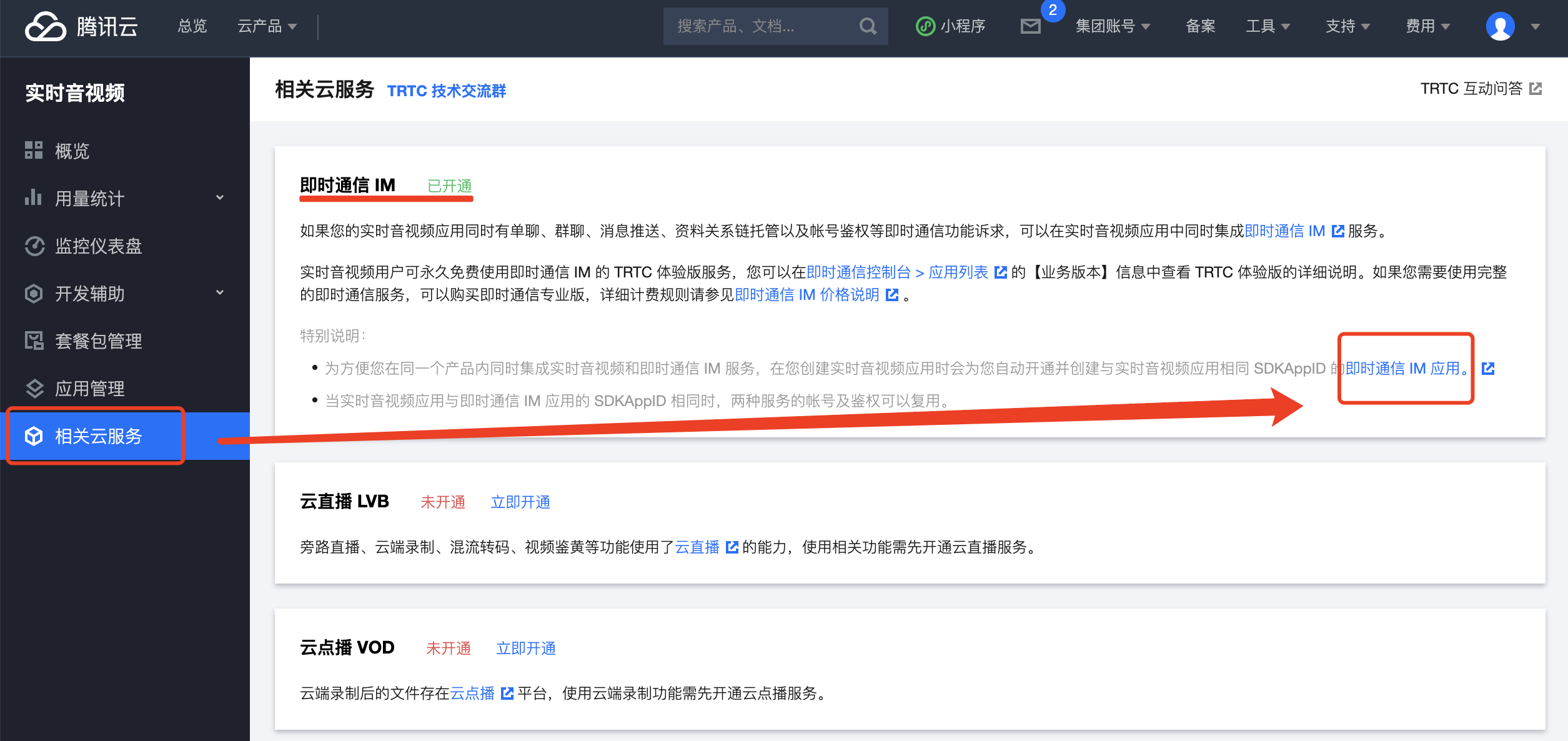 - 进入 【相关云服务】 菜单,点击下图中 【即时通信 IM 应用】 跳转到 IM 应用管理页面。