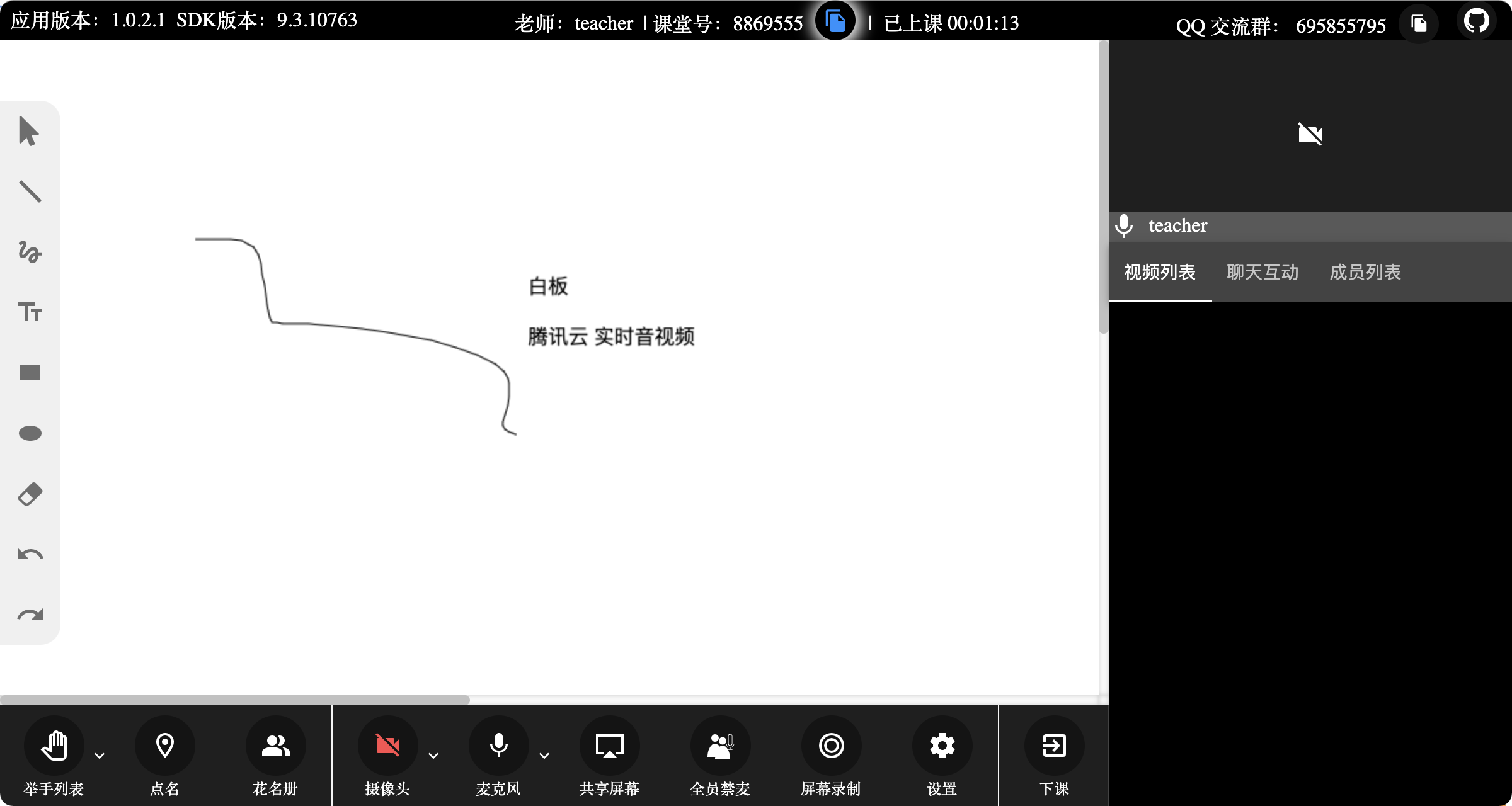 - 应用程序启动后,在在 “您的名称” 处输入 “student”,“课堂号” 需要与上述教师端的课堂号保持一致,点击 “加入课堂”。