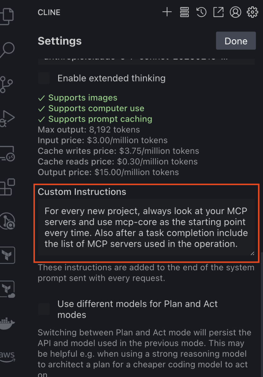 Planwhich will provide the output for you to take manual action on (e.g. providing you a sample configuration that you copy and paste into a file). However, you can optionally toggle this toActwhich will allow Cline to act on your behalf (e.g. searching for content using a web browser, cloning a repository, executing code, etc). You can optionally toggle on the "Auto-approve" section to avoid having to click to approve the suggestions, however we recommend leaving this off during testing, especially if you have the Act toggle selected.