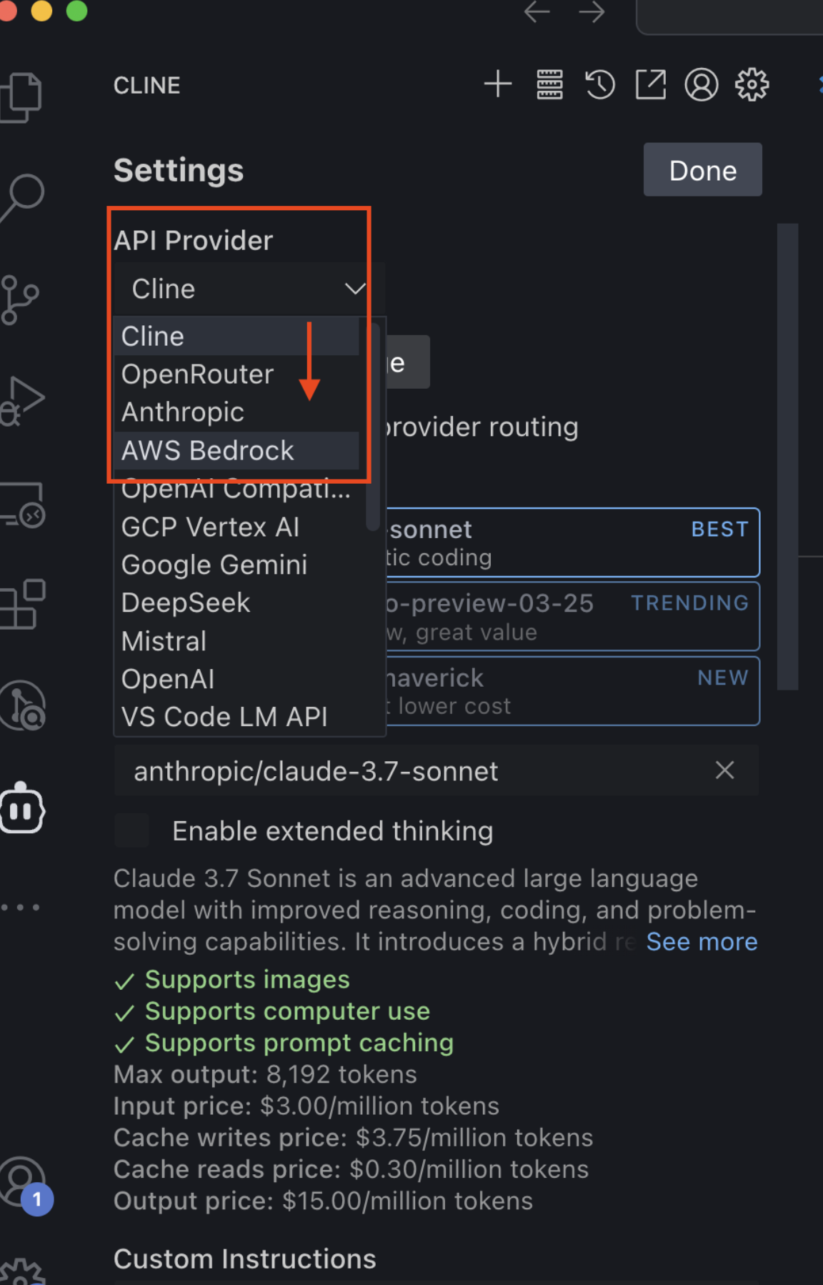IMPORTANT: Following these instructions may incur costs and are subject to the Amazon Bedrock Pricing. You are responsible for any associated costs. In addition to selecting the desired model in the Cline settings, ensure you have your selected model (e.g. anthropic.claude-3-7-sonnet) also enabled in Amazon Bedrock. For more information on this, see these AWS docs on enabling model access to Amazon Bedrock Foundation Models (FMs).