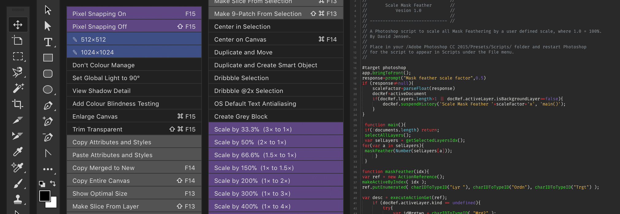 All Photoshop actions, Photoshop panels and macOS workflows created by @marcedwards. All mask feathering scripts by David Jensen. Scale patterns to 100% script by David Jensen, Mike Hale, Paul MR and Jacobolus. Improvements for the Dribbble selection actions suggested and prototyped by @darkwark. Turn Snapping On and Turn Snapping Off scripts by Marc Edwards.