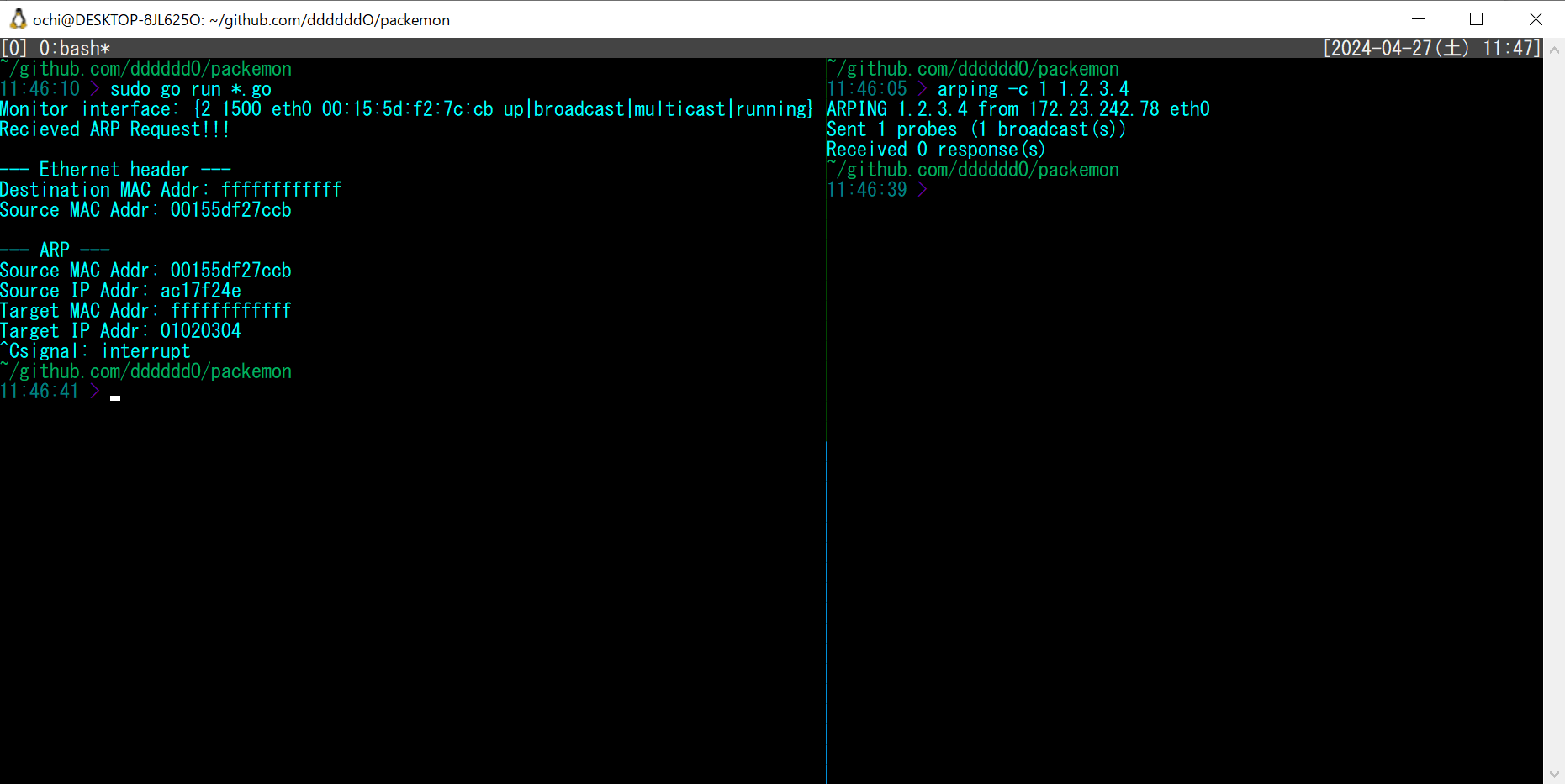 $ sudo go run cmd/packemon/main.go debugging --send --proto arp