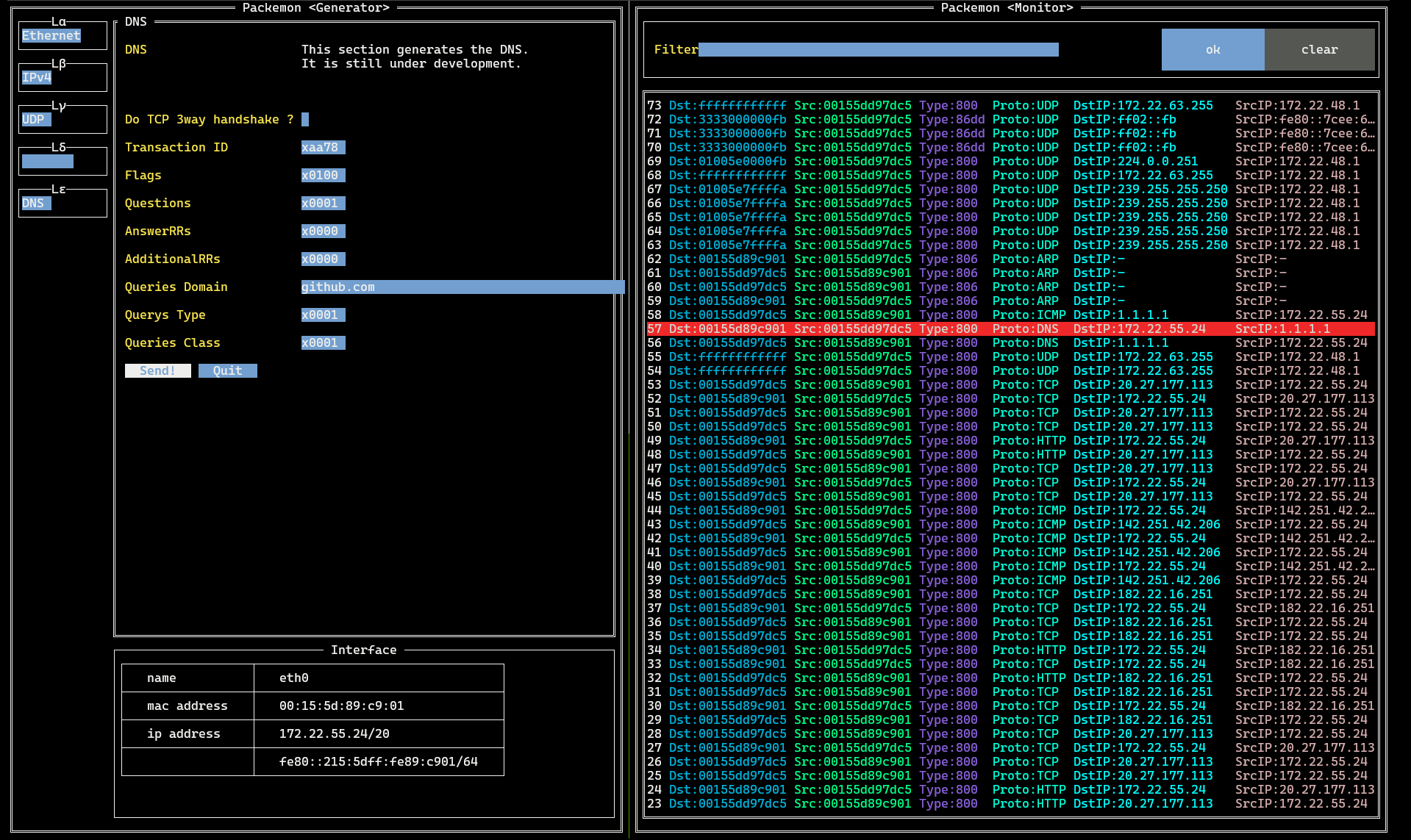 TUI tool for generating packets of arbitrary input and monitoring packets on any network interfaces (default: eth0). The list of interfaces to be specified is output when packemon interfaces is run.