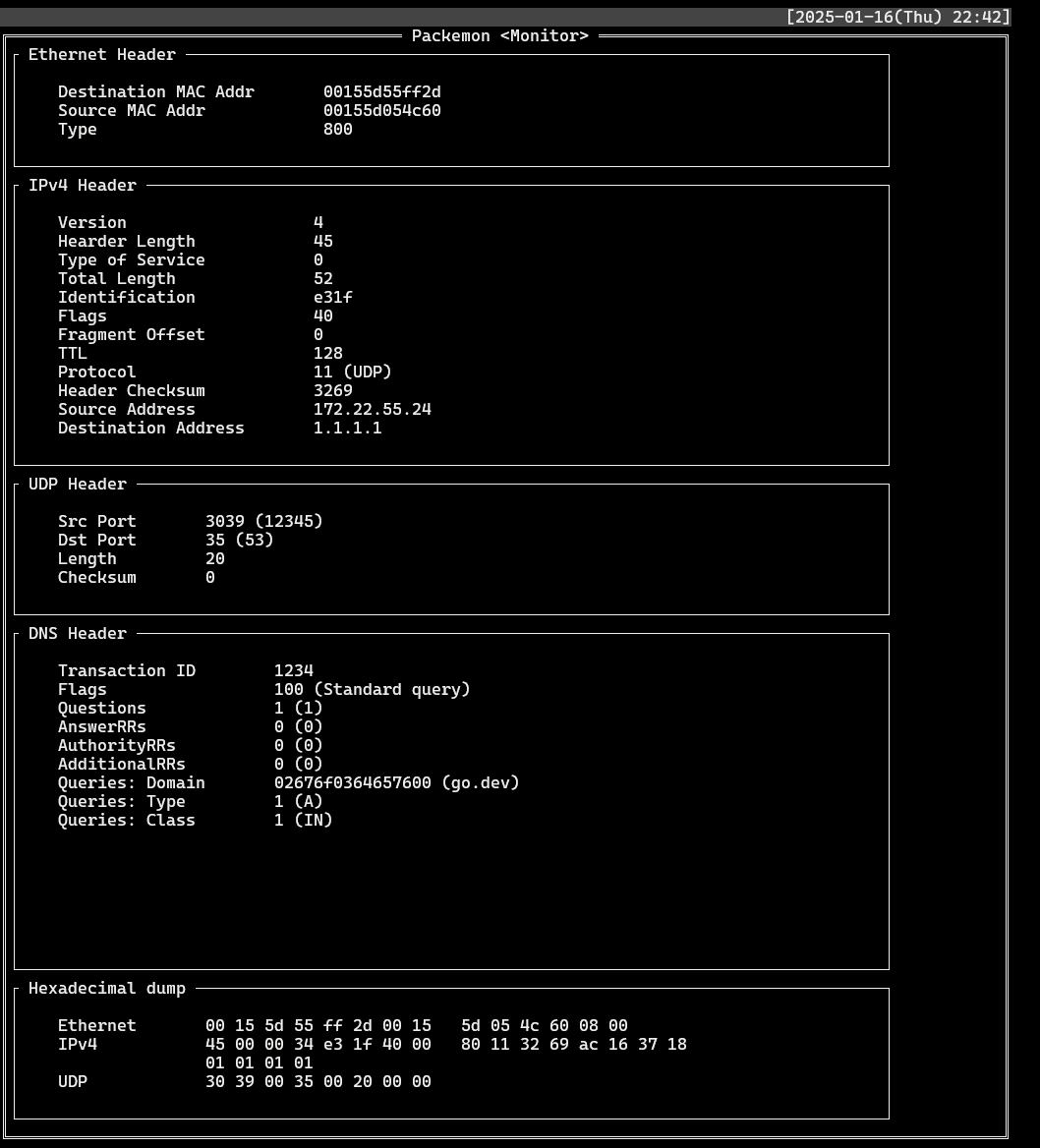 Packemon provides packet monitoring capabilities similar to Wireshark, allowing you to capture and analyze network traffic in real-time. You can filter packets, examine protocol details, and export captured data to pcapng format for further analysis.