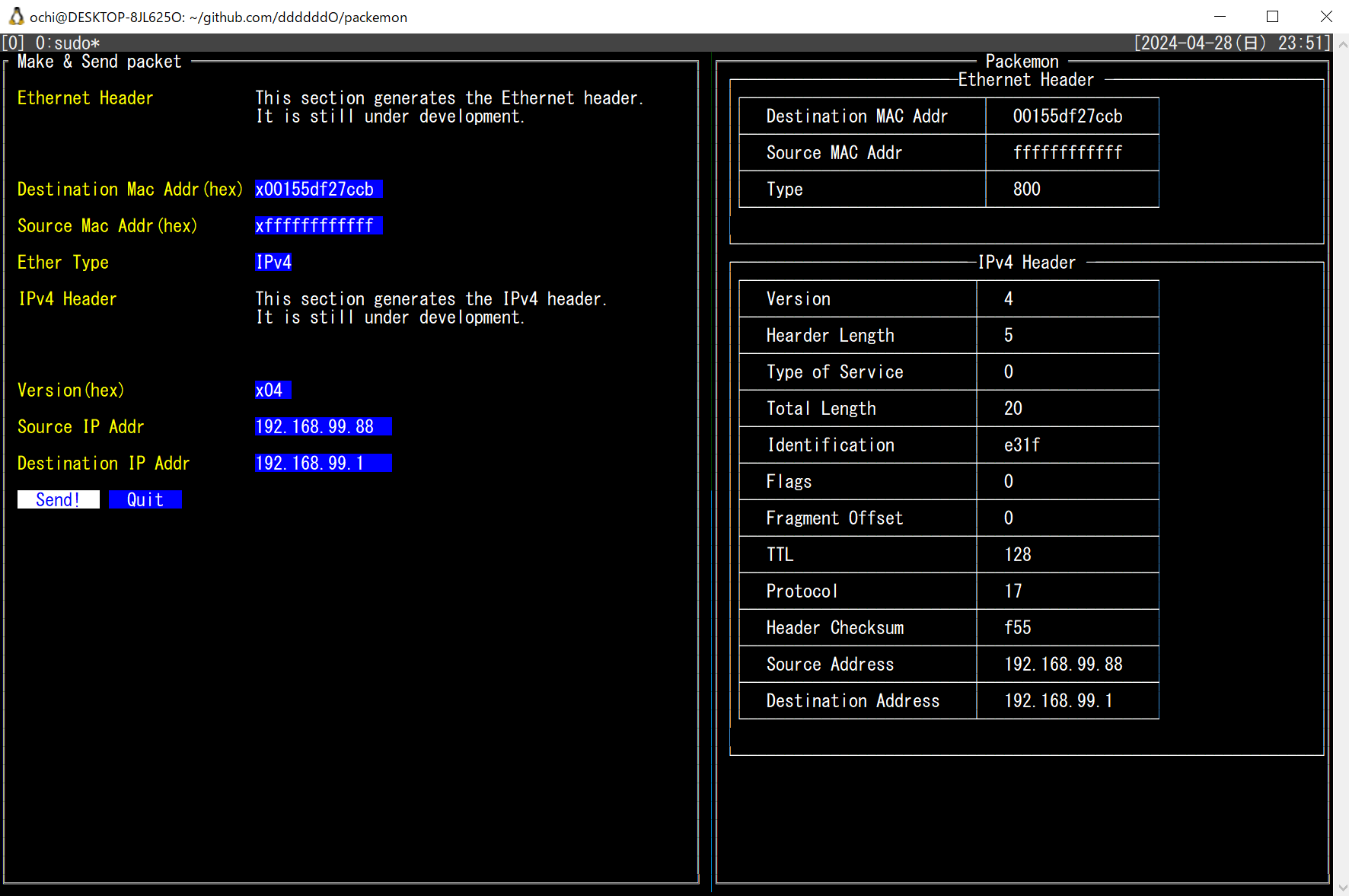任意の Ethernet ヘッダ / IPv4 ヘッダ / ARP / ICMP を楽に作れてフレームを送信できる