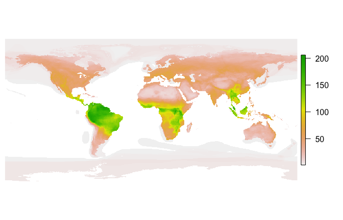plot(mammal_raster, axes=FALSE, box=FALSE)