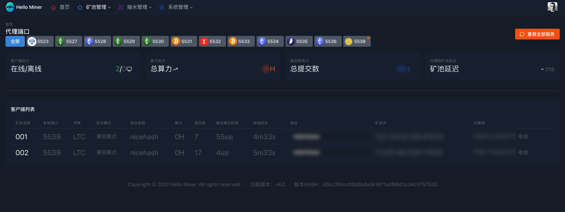 正版minerproxy专业矿池中转,支持 ETH、ETC、BTC、RVN、ERG、CFX、LTC、XMR、KDA、TON、ALPH、SERO、FIRO、BEAM、ETHW、ETF、FLUX、KAS、HNS、LBC、ZEC、XDAG、DNX,可免费定制,打造专属自己的minerproxy矿池中转,有需要进群找群主。 Web界面操作,简单易用,一键安装,小白可以轻松上手。可以自定义抽水,独创PID抽水算法,稳定精准,秒杀一切市面上随机抽水算法。完美适配各种专业机芯片机。 采用Golang语言开发,性能稳定优异。无视CC,自动CC防护,自动封IP。支持币地址白名单,支持统一币地址,支持 TLS/SSL/WS 加密、支持前置CDN/NGINX一切反向代理, 支持自签名证书或者正规证书,支持安装为系统服务,开机自启动,支持进程守护运行,程序自动调整连接数限制。Telegram交流群 点击加入 。