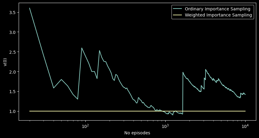 policy=pi, b=b, ordinary=True, first_visit=True, gamma=1., n_episodes=1E4)