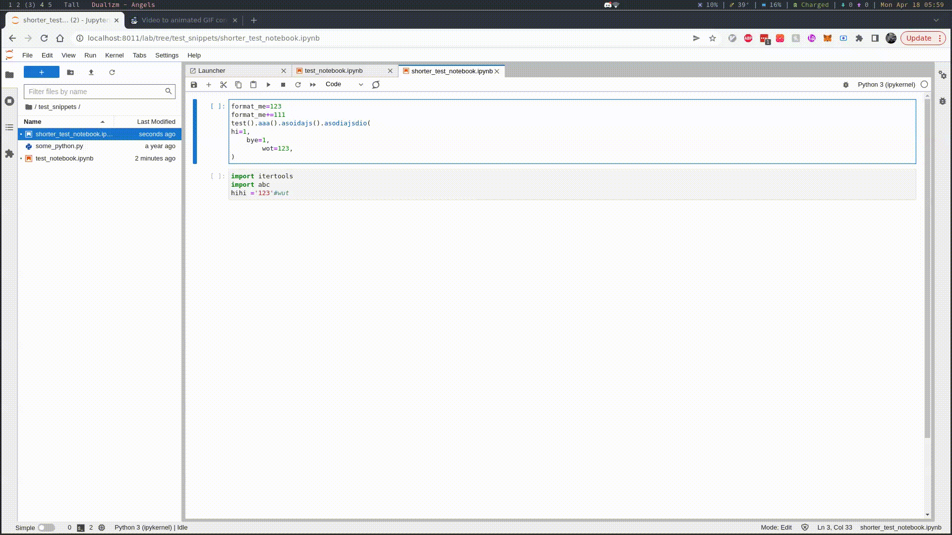 pip install jupyterlab-code-formatter- Install some supported formatters (isort+black are default for Python)