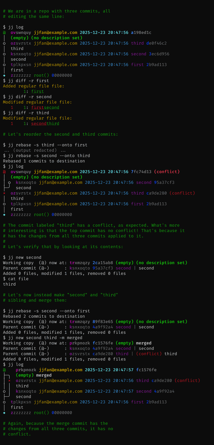If an operation results in conflicts, information about those conflicts will be recorded in the commit(s). The operation will succeed. You can then resolve the conflicts later. One consequence of this design is that there's no need to continue interrupted operations. Instead, you get a single workflow for resolving conflicts, regardless of which command caused them. This design also lets Jujutsu rebase merge commits correctly (unlike both Git and Mercurial).