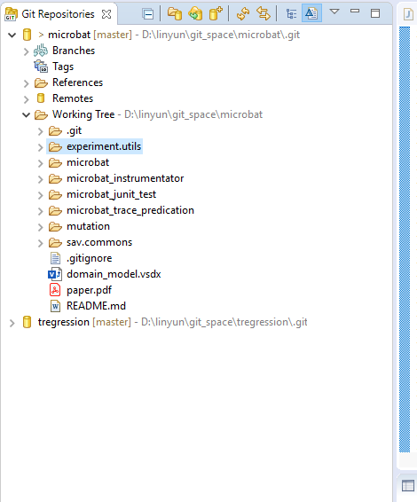 - After you clone the git repository, you need to load the microbat repository into eclipse (as the tool is manifested by Eclipse plugin). We recommend that the user should import the project through "Git perspective".