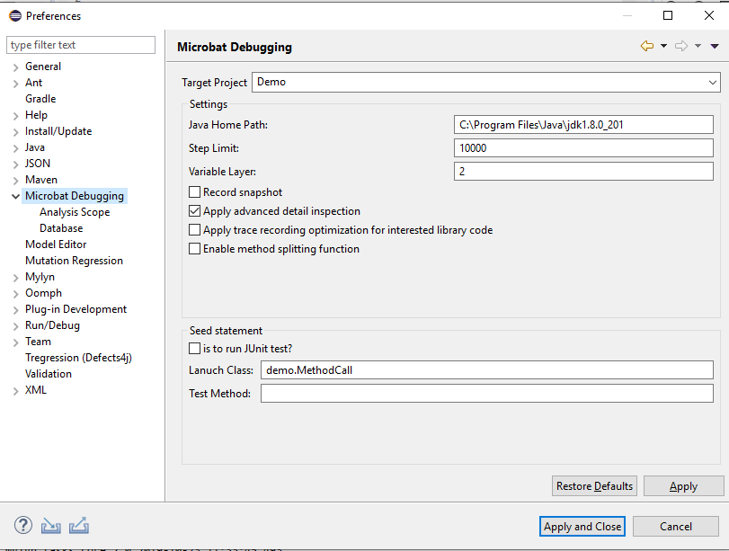 - In the running Eclipse Application, specify the configuration in Perspective>>Microbat Debugging. Here, you need to specify (1) which eclipse project you are going to debug; (2) where is the JDK library for running your Java program; (3) Step Limit (e.g., 10000); (4) Variable Layer (e.g., 2); and (5) Lanuch Class. Lanuch class is supposed to be the class containing main() method. Alternatively, you can also speicify a Junit test case.