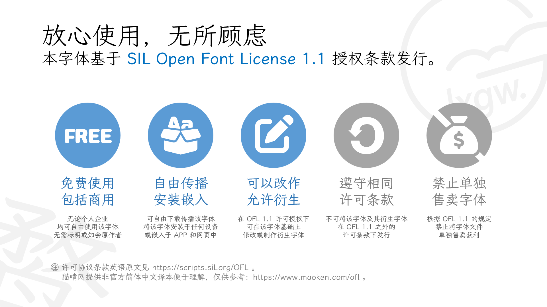 - 这款字体可以自由修改、改造,制作衍生字体。修改或改造后的字体也必须同样以 SIL OFL 公开。