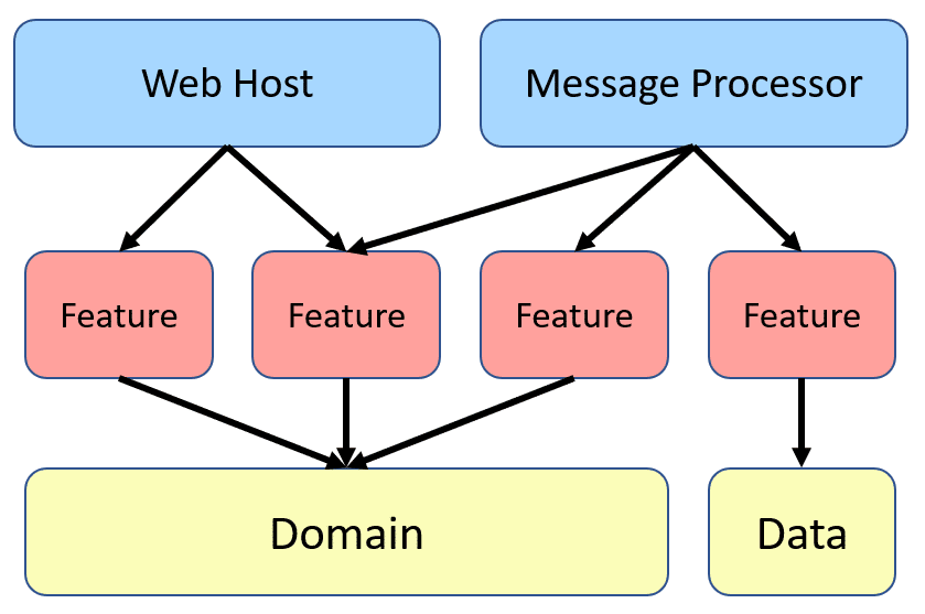 Minimize couplingbetween slices, andmaximize couplingin a slice. - With this approach, each of our vertical slices can decide for itself how to best fulfill the request. New features only add code, we're not changing shared code and worrying about side effects. For implementing vertical slice architecture using cqrs pattern is a good match.
