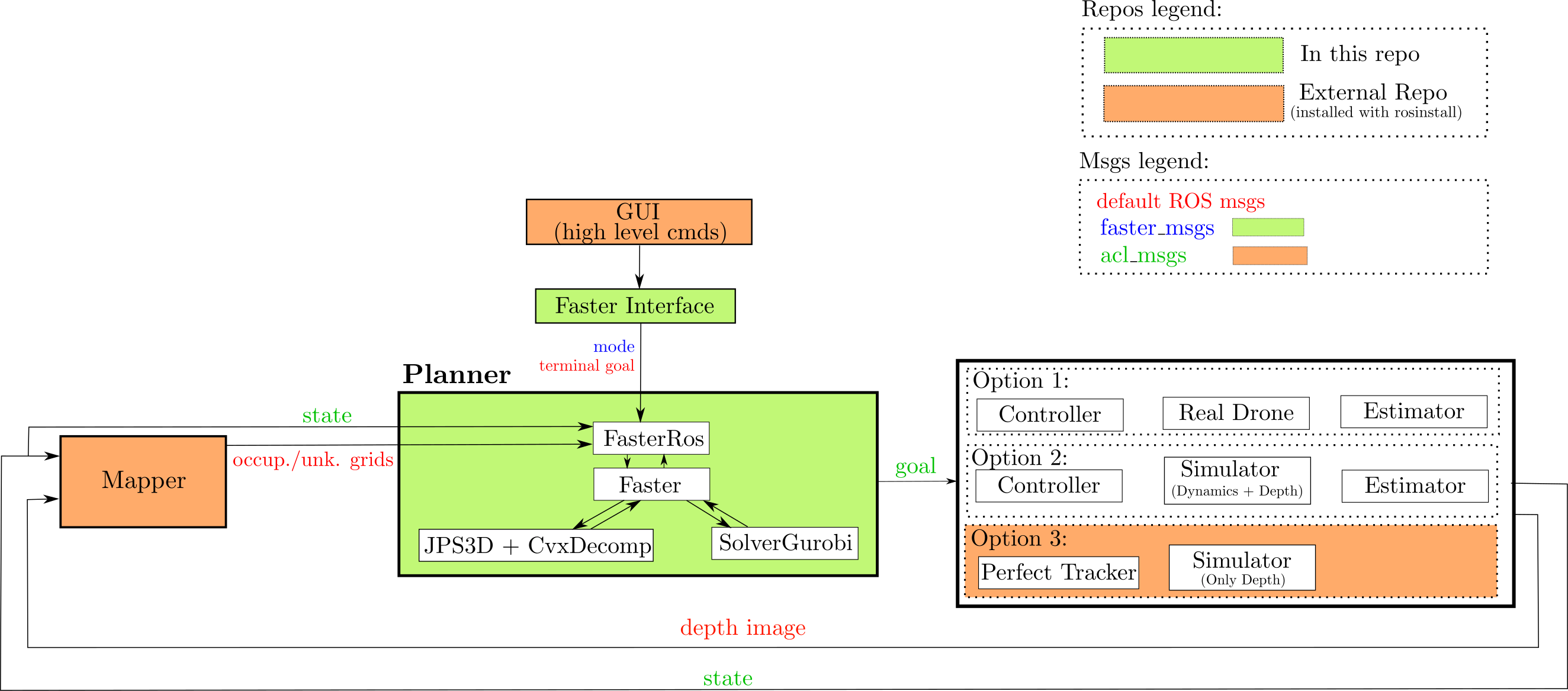 As shown in the diagram above, the UAV should subscribe to the Goal message published by FASTER. The estimator (or the motion capture) should then publish the current state of the UAV as a State message. If you are using a ground robot, you need to publish a nav_msgs/Odometry message (see this), and it will be converted directly to a State message.